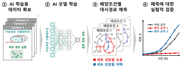 연구팀은 가상세포로부터 예측된 대사반응 데이터와 다양한 성장 데이터를 통합 분석하는 머신러닝 및 딥러닝 모델을 개발, 연구에 널리 쓰이는 모델 미생물인 대장균 K-12를 대상으로 30가지 주요 영양조건에서의 균주 성장에 중요 또는 저해되는 대사경로를 도출했다.