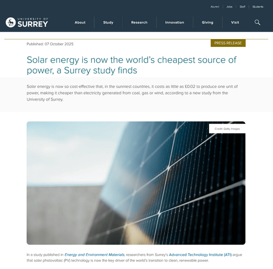 영국 서리대학 첨단기술연구소(ATI)의 연구에서 태양광 에너지가 세계에서 가장 저렴한 전력원으로 밝혀졌다고 과학기술매체 기가진이 전했다. 리튬 이온 전지를 이용한 축전 시스템과의 조합은 가스 화력 발전소에 필적하는 비용 효율이라고 한다.